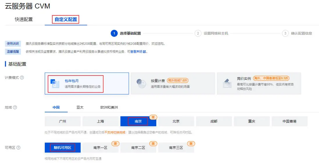 由於購買雲服務器用於網站搭建,需要長期使用雲服務器,所以選擇了包年包月計費模式。值得注意的是,官方活動通常提供包年包月計費模式。