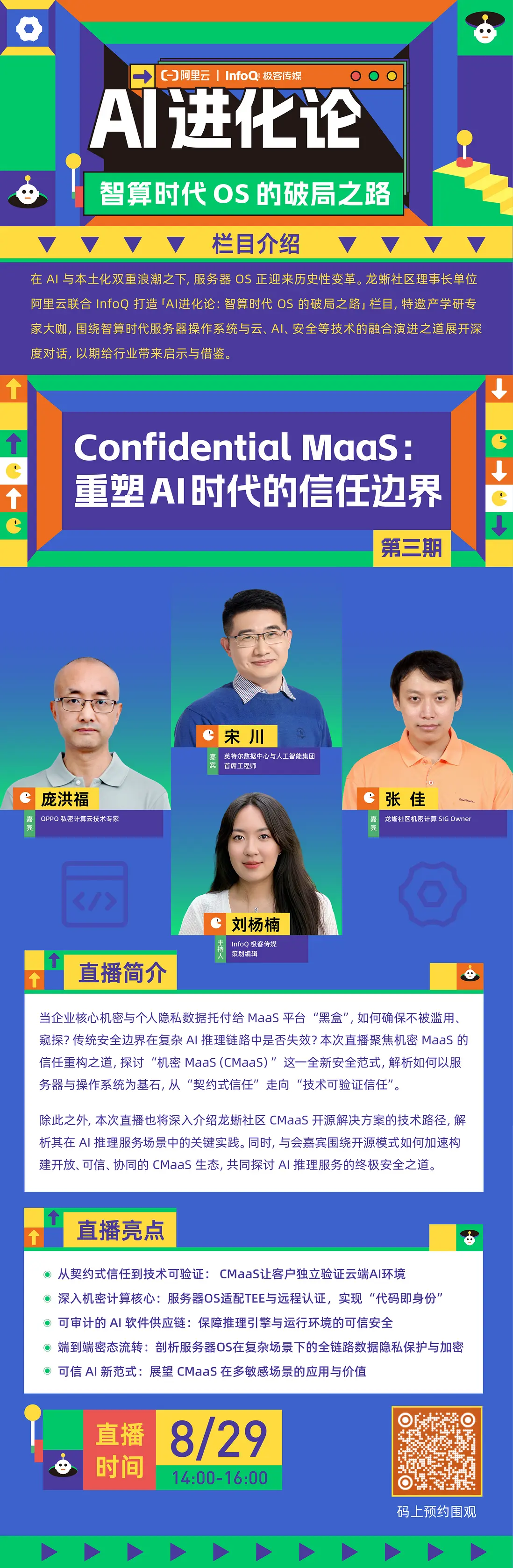 在 AI 技術加速滲透的今天,模型即服務(MaaS)成為企業高效利用 AI 能力的重要方式,但數據隱私與安全信任問題也隨之凸顯。如何在享受 MaaS 便利的同時築牢安全防線?《AI 進化論:智算時代操作系統的破局之路》系列直播第三期將於 8 月 29 日 14:00 開始,特別邀請到龍蜥社區機密計算 SIG Owner 張佳、英特爾數據中心與人工智能集團首席工程師宋川、OPPO 私密計算雲技術專家龐洪福、InfoQ 極客傳媒策劃編輯劉楊楠四位嘉賓,圍繞 “Confidential MaaS:重塑 AI 時代的信任邊界” 這一主題展開深度探討。