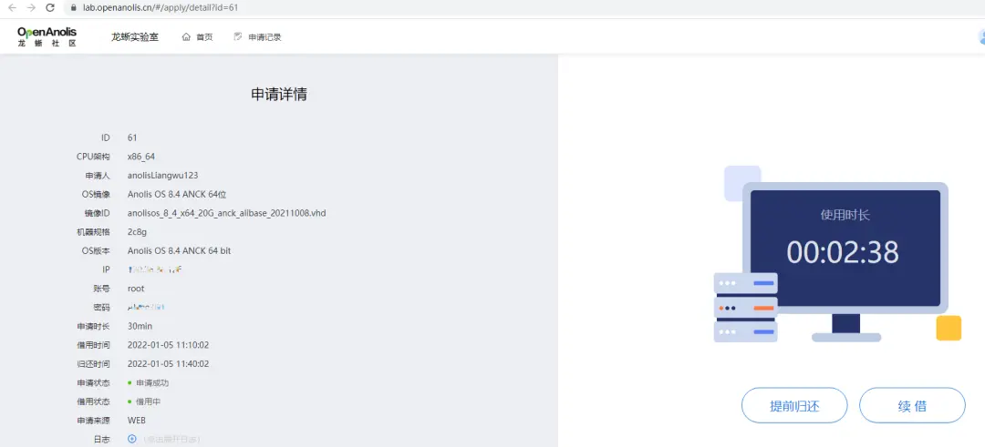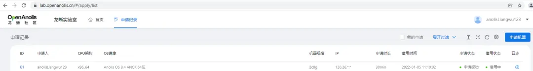 可以看到申請的機器實例均是龍蜥社區產品線中的發佈產品,社區用户只需輕鬆幾步即可免費享用龍蜥實驗室提供的預裝龍蜥操作系統(Anolis OS)的在線機器資源服務,以進行開發測試和快速的原型驗證等任務。
