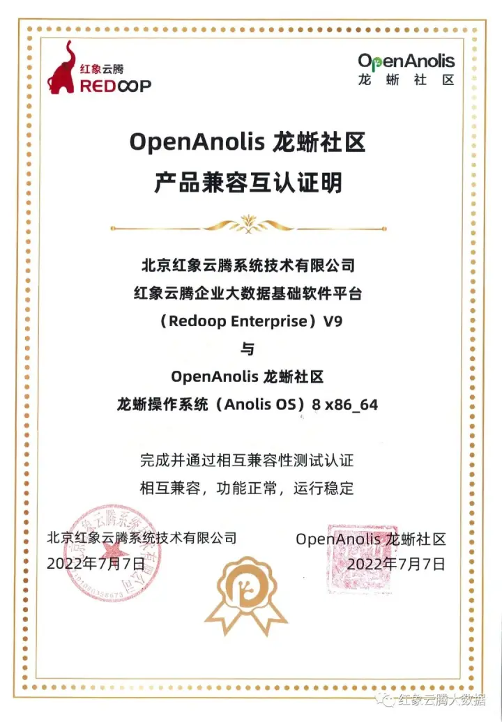 最近紅象雲騰大數據產品與生態夥伴的適配工作喜報頻傳,不久前,紅象雲騰企業大數據基礎軟件平台產品與龍蜥操作系統(Anolis OS)8 AArch64完成了兼容測試,近日,紅象雲騰與龍蜥社區工作人員再次聯合嚴格測試,紅象雲騰企業大數據基礎軟件平台(Redoop Enterprise)V9完成了與龍蜥操作系統(Anolis OS)8 x86_64的兼容適配,完成並通過相互兼容性測試認證,相互兼容,功能正常,運行穩定。