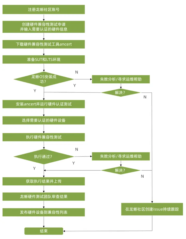 社區用户,IHVs 或者硬件設備集成商等通過安裝龍蜥 OS 硬件兼容性驗證工具 Ancert,對相關硬件設備執行兼容性測試,並將測試結果提交到龍蜥社區硬件兼容性列表,測試結果經過龍蜥社區硬件兼容性 SIG 審核通過之後就可以發佈到龍蜥社區硬件兼容性列表上。