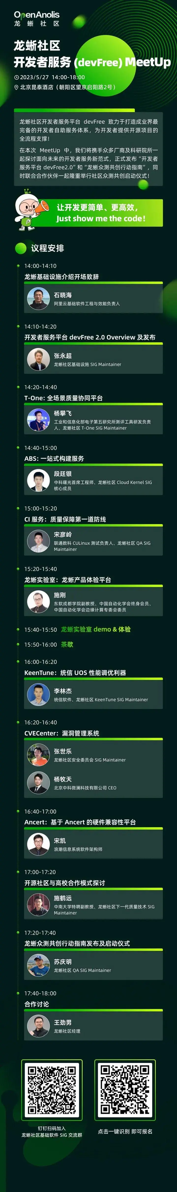 開發者服務平台 devFree MeetUp 由龍蜥社區基礎設施 SIG 主辦,本次活動邀請了阿里雲、電子五所、浪潮信息、聯通數科、統信軟件、中科曙光、中科微瀾及成都東軟學院、中南大學等眾多廠商及科研院所一起探討面向未來的開發者服務新範式,正式發佈“開發者服務平台 devFree2.0”和“龍蜥眾測共創行動指南”,同時聯合合作伙伴一起隆重舉行社區眾測共創啓動儀式!