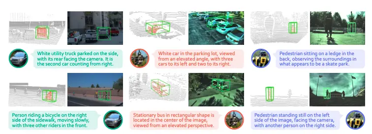 3EED 數據集共包含 20,367 個時間對齊的多模態幀,覆蓋車輛、無人機與四足機器人三類平台。數據提供 128,735 個三維目標框以及 22,439 條經過人工驗證的語言指代表達,是當前規模較大的三維視覺指代數據集之一。