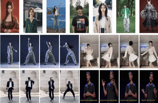 X-Dance 數據集包含 12 段驅動視頻,其中 8 段為高動態舞蹈動作,4 段為低幅度日常行為,涵蓋運動模糊、遮擋、姿態劇變等多種真實場景變化。針對每段動作,數據集構建多源參考圖像,包括動漫角色、半身照片、跨風格人物以及姿態差異顯著的圖像,用於模擬空間結構不一致與時間起點不連續等情況。