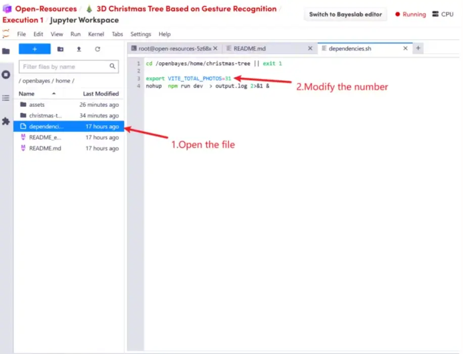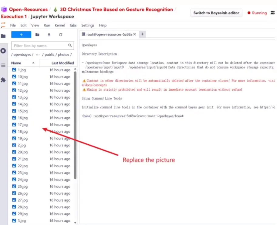 直接將你自己的照片複製到 /openbayes/home/christmas-tree/public/photos 文件夾中,覆蓋原有的圖片即可。請保持文件名格式不變(1.jpg,2.jpg 等)。