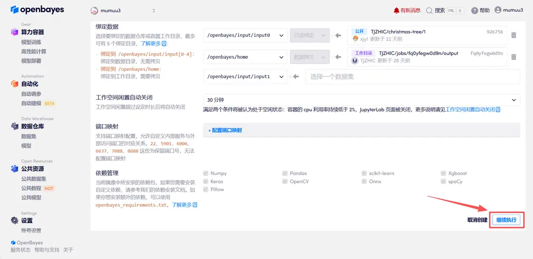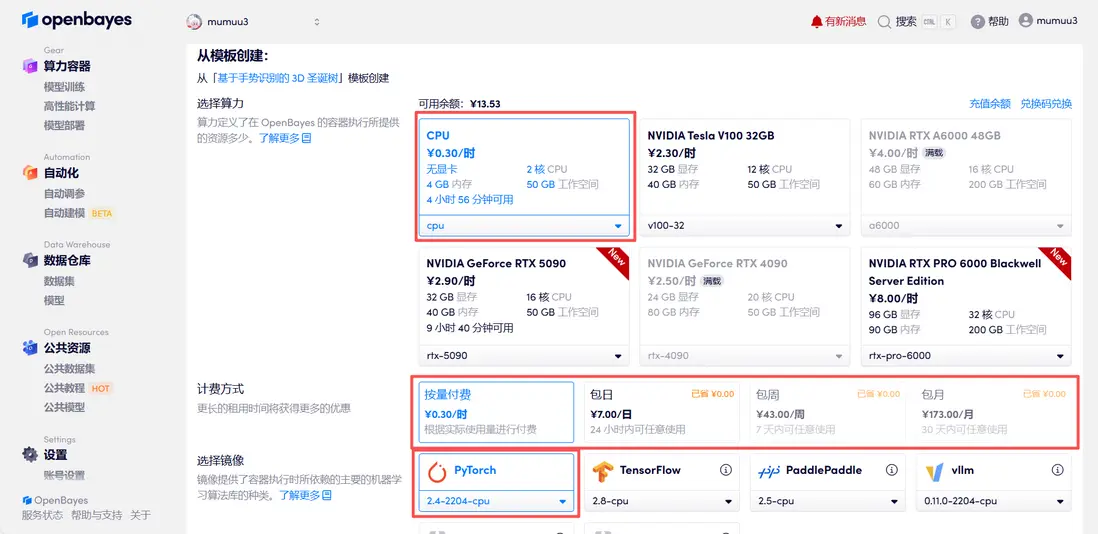 3.選擇「CPU」以及「PyTorch」鏡像,按照需求選擇「按量付費」或「包日/周/月」,點擊「繼續執行」。新用户使用下方邀請鏈接註冊,可獲得 4 小時 RTX 5090 + 5 小時 CPU 的免費時長!
