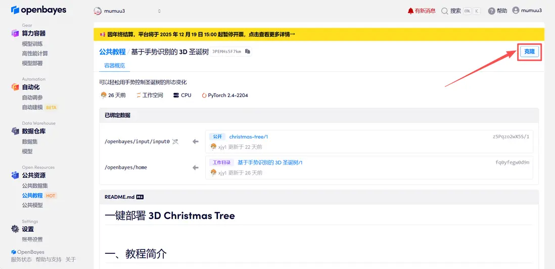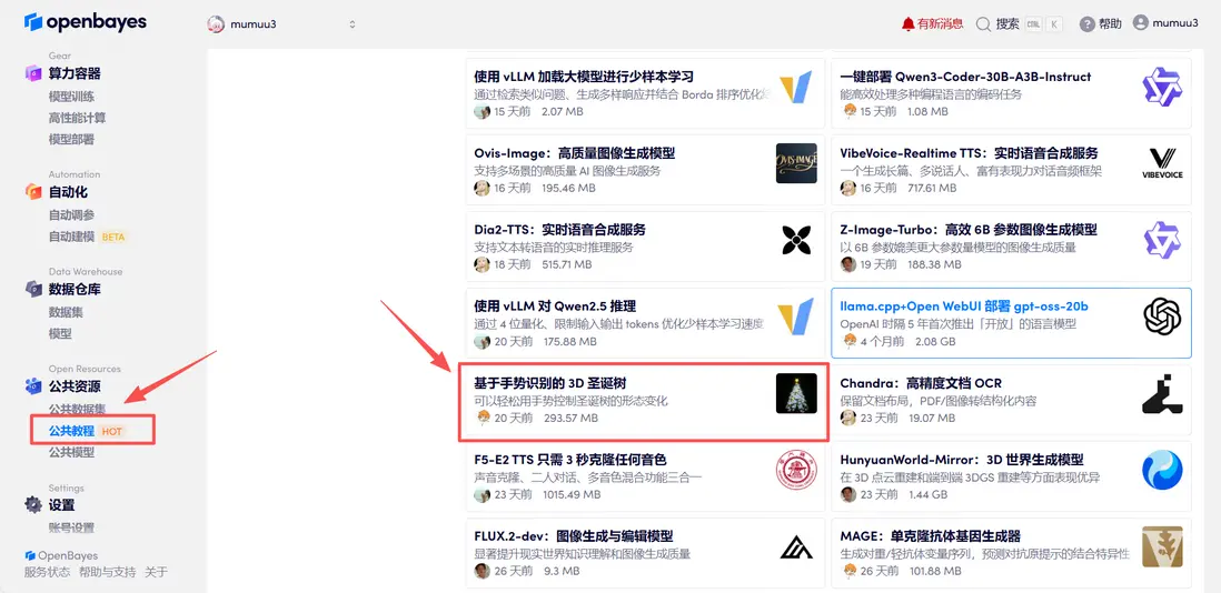 1.登錄 OpenBayes.com,在「公共教程」頁面,選擇「基於手勢識別的 3D 聖誕樹」教程。