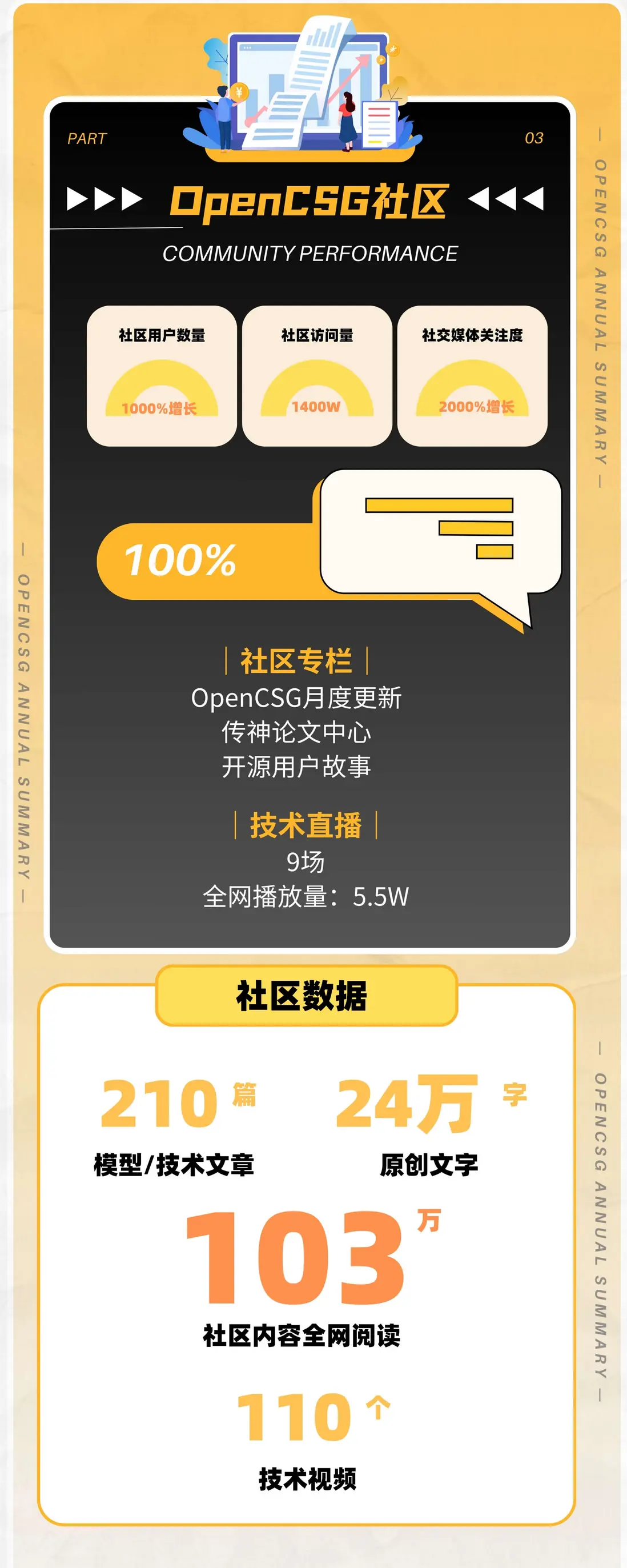 回首這一年,OpenCSG社區實現了穩步發展:數據集持續迭代更新,高質量模型不斷涌現,開源工具日益完善,每一步都凝聚着大家的智慧與汗水。在此,OpenCSG將彙總並回顧過去一年中的進展與成果,以慰謝與迴應這一路上所獲得的鼓勵、建議、指正、啓發與認可!