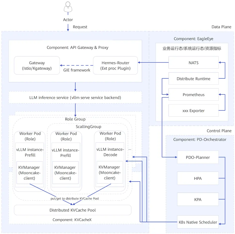 openFuyao通過“聚焦智能動態路由 + xPyD計算動態資源管理調度 + 分佈式KVCache/KVCache優化 + 端到端易用性 + 推理場景可觀測體系”高性能、可擴展子系統的構建,致力於系統性突破當前LLM推理的瓶頸,同時面向超節點場景進一步加速,支持靈衢、CXL、NVLink等高速總線: