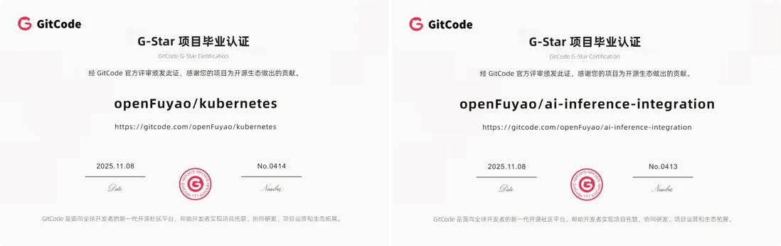 社區兩大核心項目openFuyao/ai-inference-integration與openFuyao/kubernetes獲GitCode官方G-Star項目認證,入選GitCode G-Star計劃優質項目行列。這不僅是對openFuyao技術實力與社區運營能力的權威認可,也意味着openFuyao與GitCode達成深度合作,將攜手為開源軟件生態建設注入新活力。