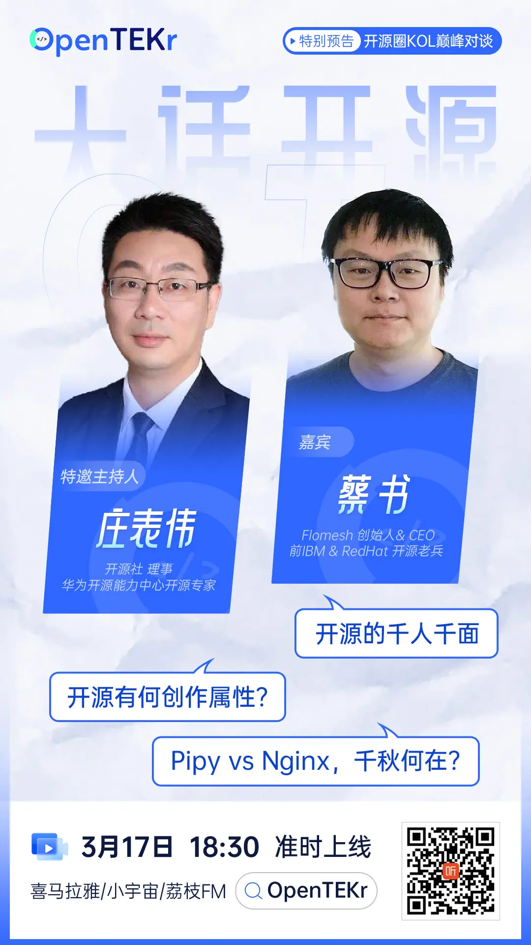 首期嘉賓,我們邀請到了 Flomesh 創始人兼 CEO 的蔡書,同時請來了圈裏的思想達人、江湖人稱“表哥”的莊老師客串主持人,來與蔡老師同台思想碰撞。想一聽蔡老師成長背後的123?想知道 Pipy 從0到1的前因後果?