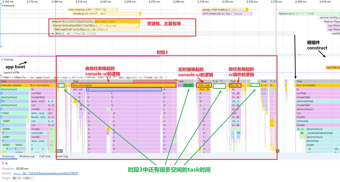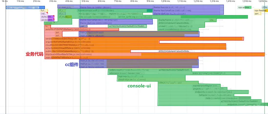 時段小結: 這一時段主要是完成各種HTTP請求,主要有 業務代碼、console-ui、cc組件三方參與。首輪請求主要是業務代碼的請求,採用h2協議,console-ui及cc組件則多為非首輪請求。