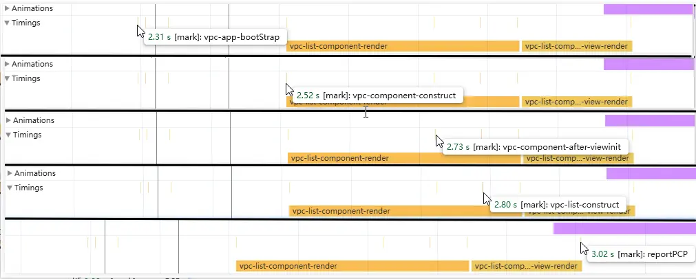 例如,針對VPC列表頁的主渲染流程,我們在 NG App啓動、根組件constructor及ngAfterViewInit、列表頁組件constructor及ngAfterViewInit,分別加上performance.mark,則能在Timings面板中看到下圖情況: