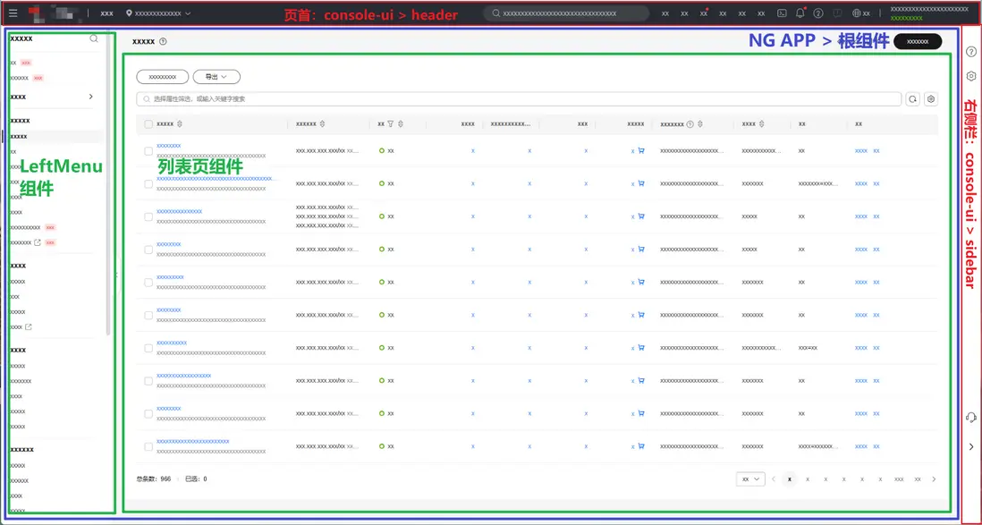 - 紅色框:由基礎框架console-ui提供的header、sidebar 實現