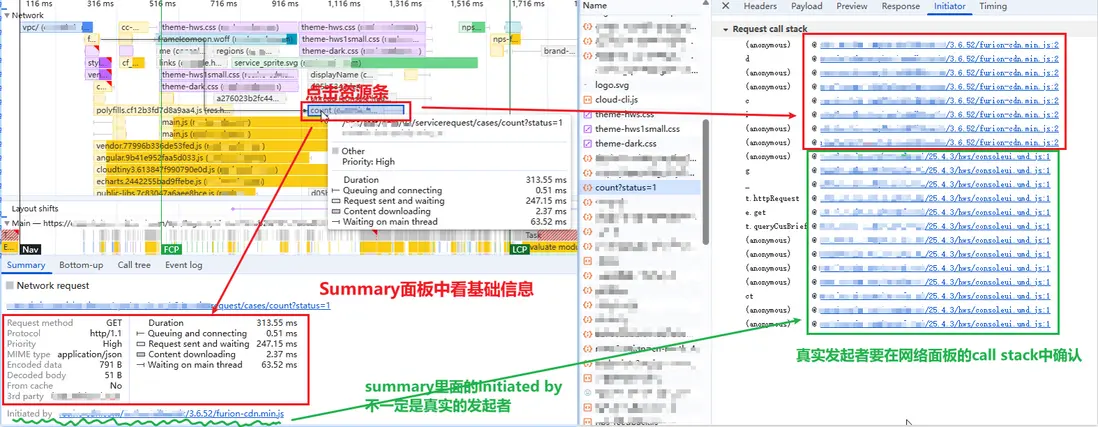 PS:有時候,Summary面板中寫的Initiated by不一定是真實的發起者,真實發起者可能被層層代碼封裝隱藏了,我們需要到Network面板中的Initiator裏面去找真實發起者