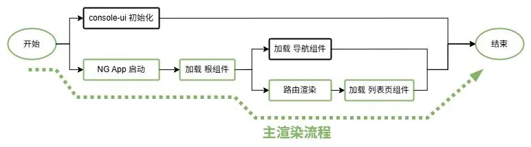 通過上一節中對性能圖透徹分析之後,我們已經能將性能圖跟源碼對應起來,並且能將性能圖跟加載流程對應起來,同時對一些關鍵節點心中有數。接下來要做的就是找問題、找可優化的空間,以達到我們的目標。例如針對VPC列表頁的分析可知,主渲染流程在性能圖中大致是: