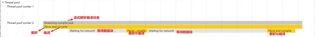 由於Thread pool線程池裏面有多個線程(worker),所以每個靜態資源很容易分配到一個worker進行解析。而且現代瀏覽器一般是流式解析和編譯,也就是上圖中的Streaming compile task,它表現為:每收到一個數據塊就解析一個數據塊