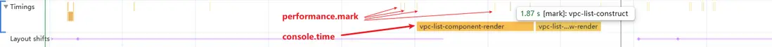 記錄一些時間信息,包括頁面加載的關鍵時間節點。並能體現出如console.time、performance.mark等。 (PS:在代碼中寫的performance.mark會體現為這裏的一條條細線,而console.time會體現為這裏的一個個色塊。我們在代碼的關鍵節點增加一些mark、time,就能在分析面板中直觀的瞭解當前的頁面加載進度)