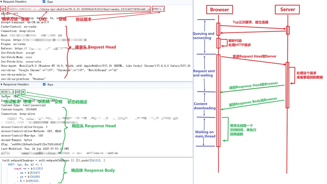 前面對Network面板的介紹中提到,一個HTTP請求會經過4個階段:Queuing and connecting、Request sent and waiting、Content downloading、Waiting on main thread。這4個階段從HTTP報文的視角,會比較好理解。