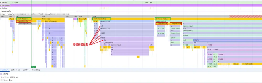 另外,在圖中我們還看到Evaluate script下面出現了Compile script,這是因為V8引擎的惰性編譯策略。worker中的編譯動作並不會將整個代碼中的所有函數一次性全部編譯掉,它通常只編譯頂層代碼和可能會立即要被調用的函數,這樣能避免編譯非必要代碼。所以在Evaluate script的過程中,如果主線程要執行一個尚未被編譯的函數,那麼它會通過即時編譯器(JIT) 來編譯這個函數。另外,有一些代碼(例如內聯script)只能在主線程中編譯。同樣的,Evaluate module下面會出現Compile code,可能是因為它要執行一個從別的module引用過來的函數,需要先JIT編譯。