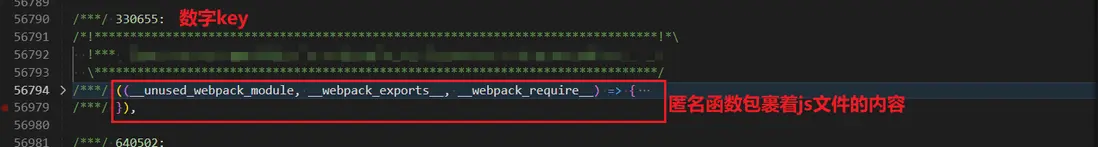 3. 一些數字:webpack打包時,會將多個js文件打成同一個chunk。而在chunk中,每個文件都會被包裹在一個匿名函數中,並放在一個對象中同時生成一個數字作為key。