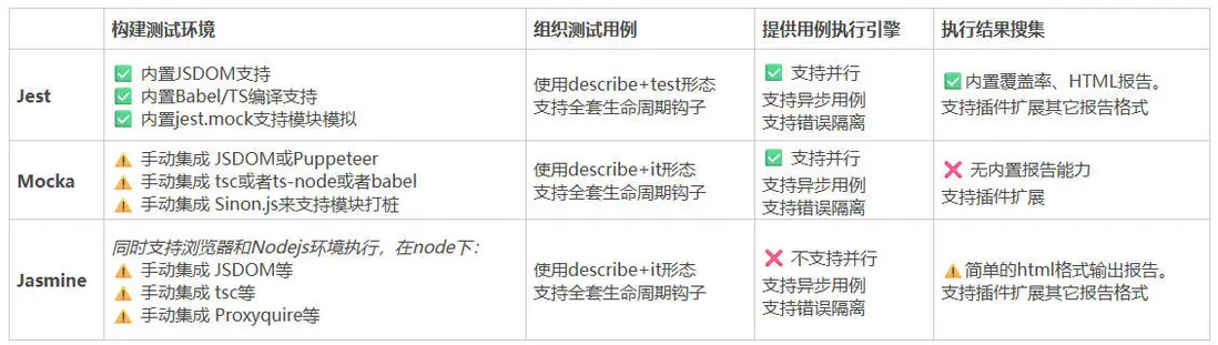 前端單測框架有很多種,能力各異。這裏選常見的幾種,就上述4個方面進行對比,如下: