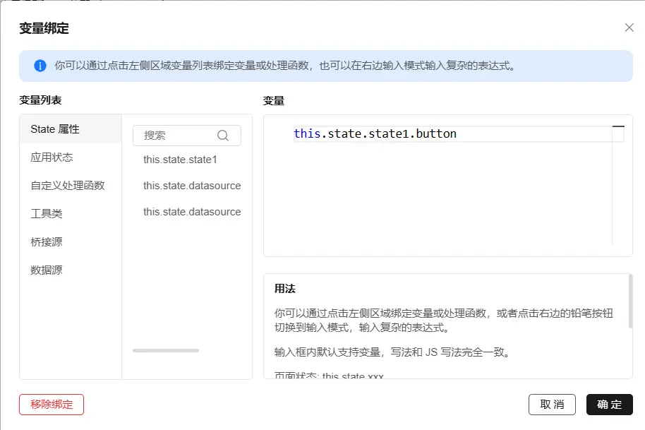 text的 JSExpression,讀取this.state.state1.button,初始值為 1; - 解析