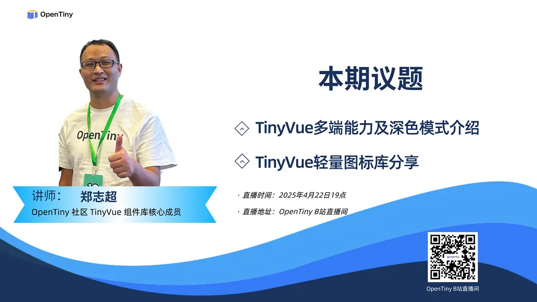 4月22日19點,雲計算高級前端開發工程師,TinyVue 項目成員鄭志超、申君健老師,將為大家分享 TinyVue 多端模板與模式切換,並與大家介紹 TinyVue 輕量圖標庫的使用。本次直播將圍繞 TinyVue 的最新版本展開。首先,為大家介紹 TinyVue 多端模板架構,接着為大家講解 Mobile-First 多端模板用法,並通過實際案例向大家演示 UI 效果對比,當然還有圖標庫分享等着大家。同時,直播過程中還會設置技術答疑環節,歡迎大家積極提問,我們將現場為大家答疑解惑。無論你是技術大牛,還是初學者,相信這場直播都會讓你收穫滿滿!