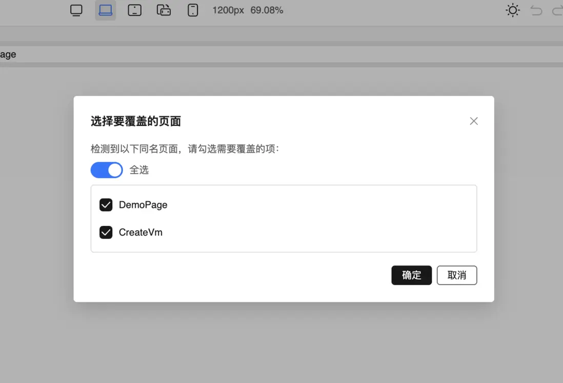 .vue文件。 - 若存在同名頁面,按提示“覆蓋/跳過/全部覆蓋”進行處理。