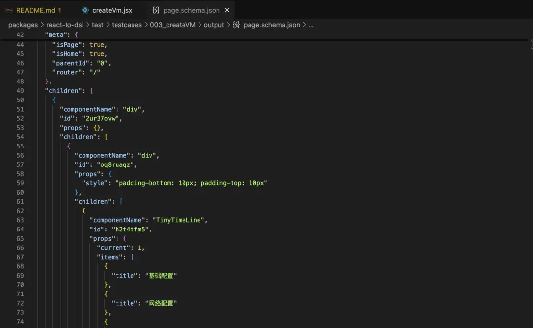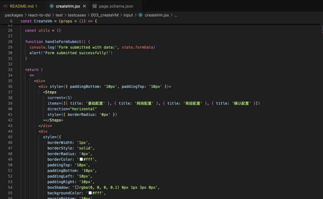 當前 React-To-DSL 以測試用例形態展示能力,可在包內直接運行: