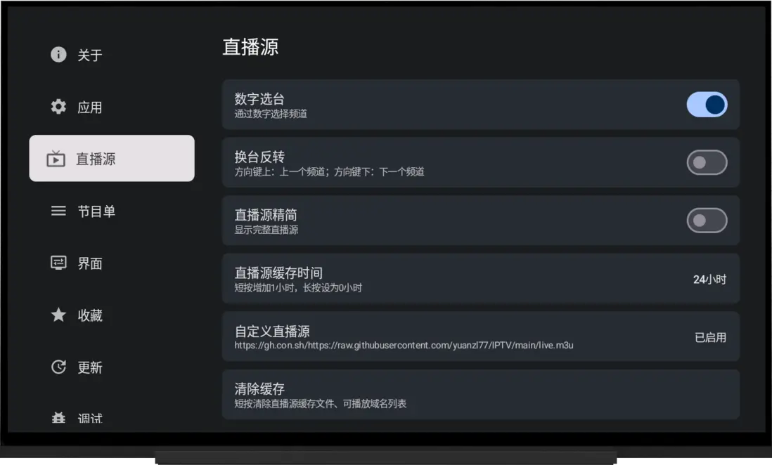 若想收藏某個直播頻道,可以打開應用選台界面,選中某一頻道,長按OK鍵、長按屏幕,將收藏或取消收藏該頻道。若想切換顯示收藏列表,首先移動到頻道列表頂部,然後再次按下方向鍵上,將切換顯示收藏列表。