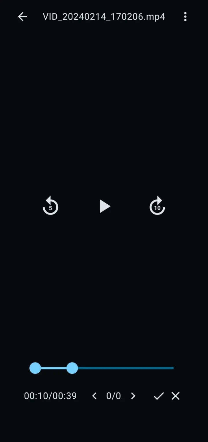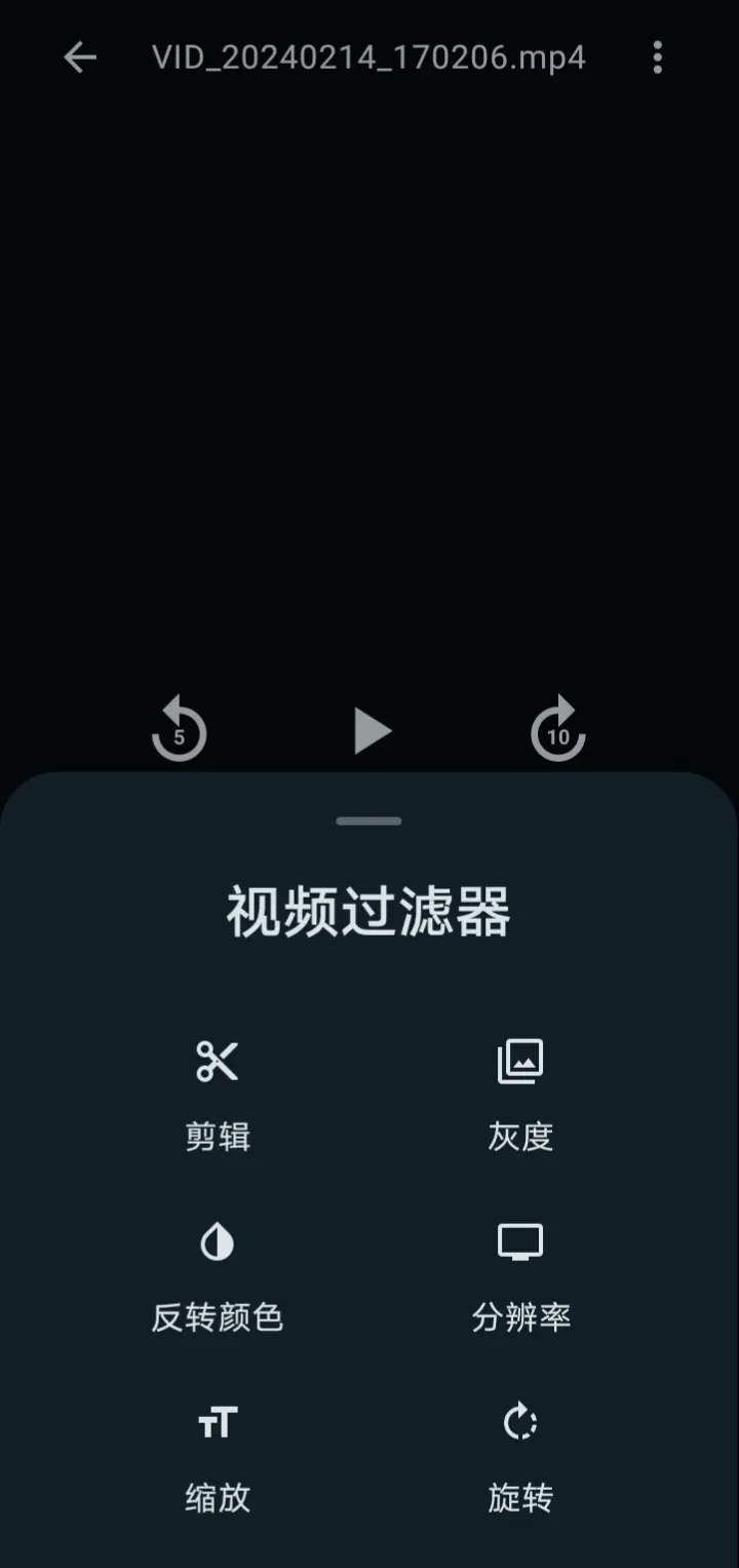 分別拖動兩個圓珠確定裁剪的起止時間後,點擊右下角的打勾按鈕,此時進度條長度變為視頻片段的持續時間比如10秒。點擊界面右上角的三點按鈕,彈出操作菜單列表如下圖所示: