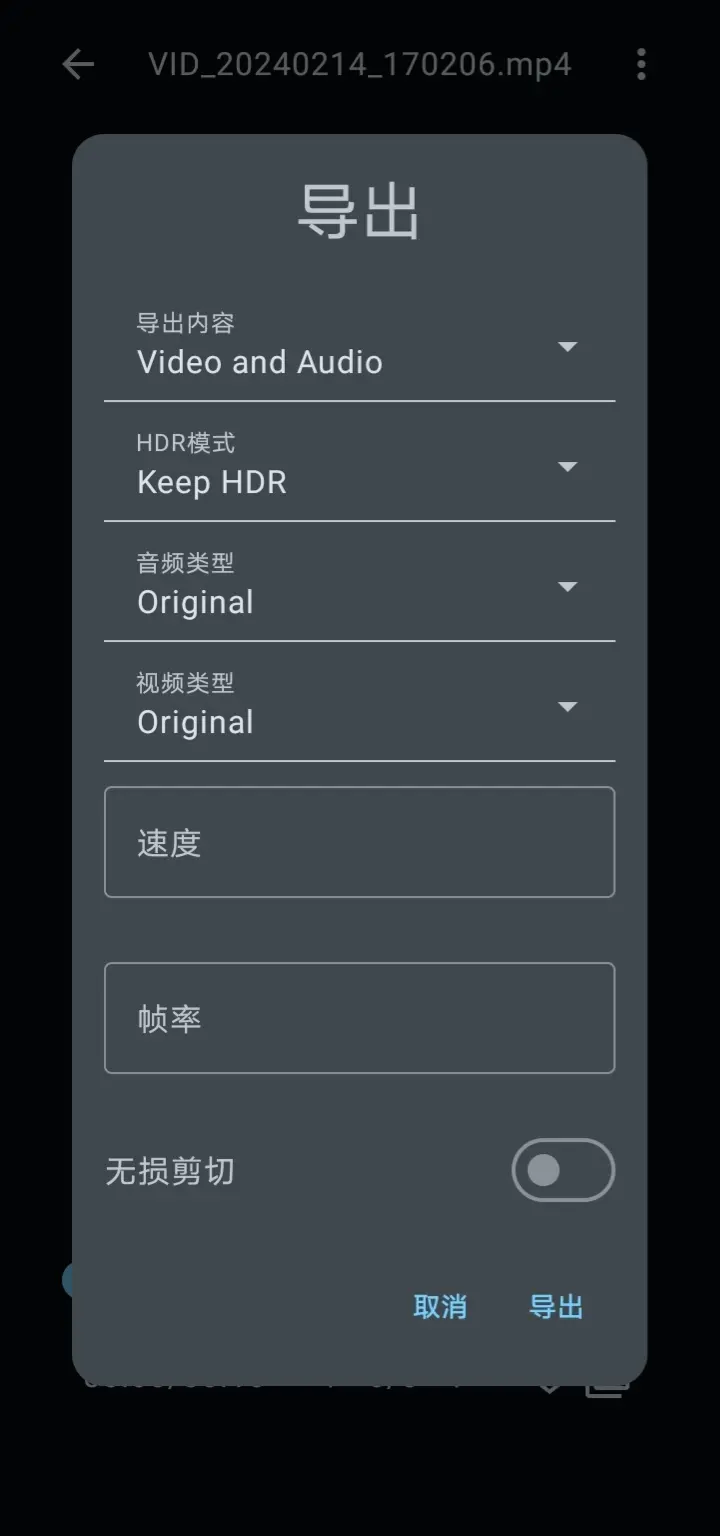 在配置界面可以選擇導出方式與音視頻的編碼格式,點擊右下角的導出按鈕跳到保存目錄的選擇界面,選擇某個公共目錄比如Download,即可將視頻片段保存到Download目錄。