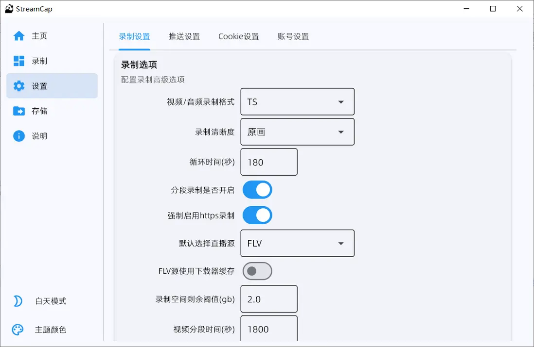 在設置界面支持修改包含基礎設置、代理設置在內的錄製選項,也支持修改推送設置、Cookie設置、賬號設置等配置信息,方便用户個性化定製直播錄製信息。