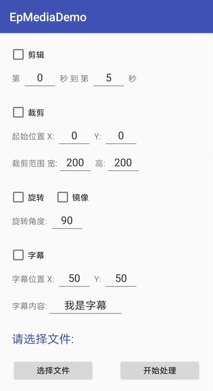 那麼通過Android Studio Dolphin編譯EpMedia並安裝到真機上,點擊【處理單個視頻】後進入單視頻的編輯頁面如下圖所示: