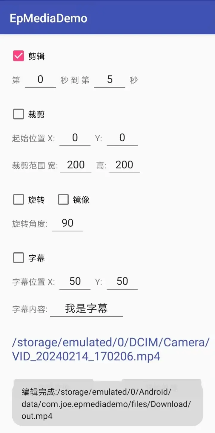 EpMedia是一款基於FFmpeg開發的國產視頻處理框架,簡單易用,體積小,幫助使用者快速實現視頻處理功能。EpMedia包含以下功能:剪輯、裁剪、旋轉、鏡像、合併、分離、添加LOGO、添加字幕、添加濾鏡、添加背景音樂、加速減速視頻、倒放音視頻等等。