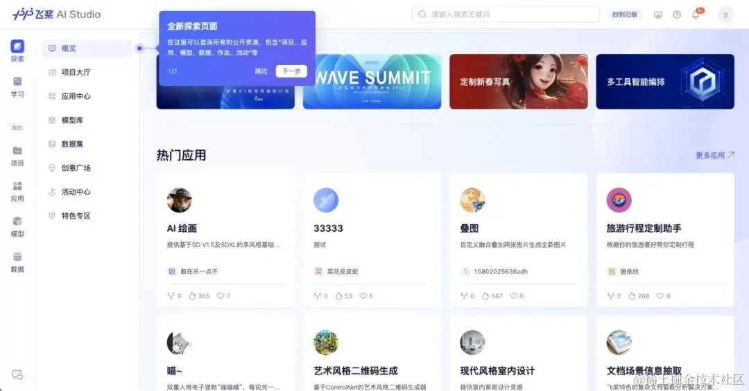 全新探索頁面,可以查閲所有公開資源,包含“項目、應用、模型、數據、作品、活動”等。