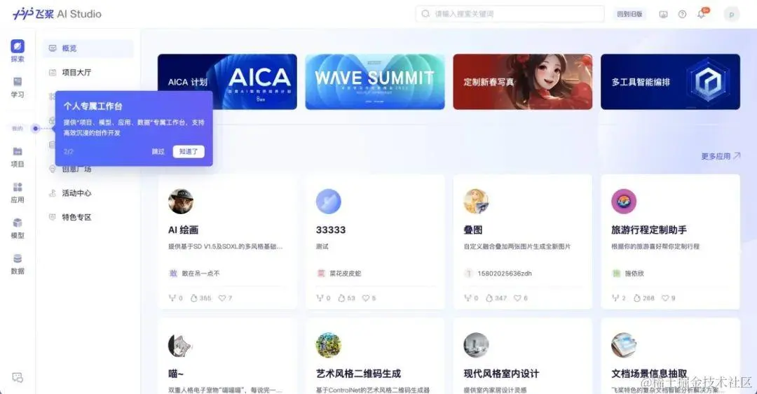 全新個人工作台,提供“項目、模型、應用、數據”專屬工作台,支持高效沉浸的創作開發。