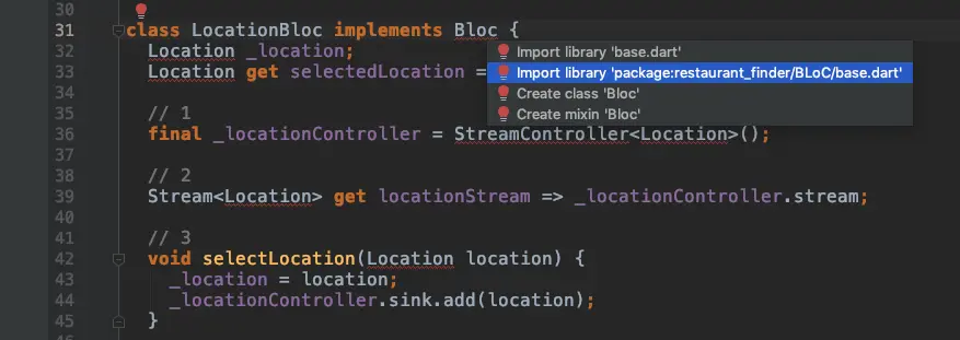 使用 option+return 導入基類的時候,選擇第二個選項 - Import library package:restaurant_finder/BLoC/bloc.dart。