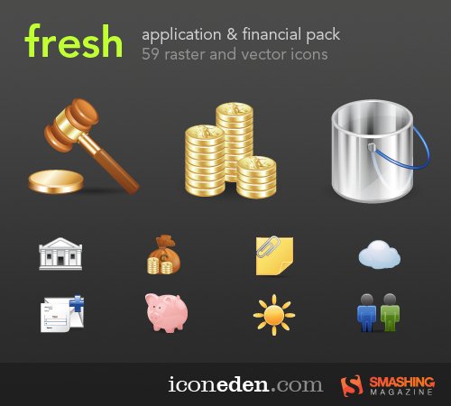 Fresh Icons Set This set contains 59 raster and vector icons. The set includes icons in PNG, ICNS and ICO formats. An EPS vector file is available as well.