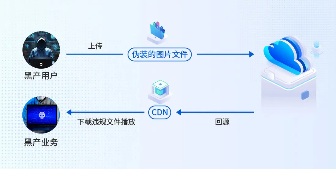 因為「你看到的黑不是黑」,看到的圖也並不是普通的圖,而是以圖片之名暗藏其中的黑產數據。這些黑產平台往往是一些非法視頻網站,他們將自己的視頻切片文件巧妙偽裝成圖片,然後通過 App 開發者正常的接口上傳至雲存儲中。一旦上傳完成,黑產用户便能在黑產業務裏引用對應的地址,將偽裝文件下載後還原播放。