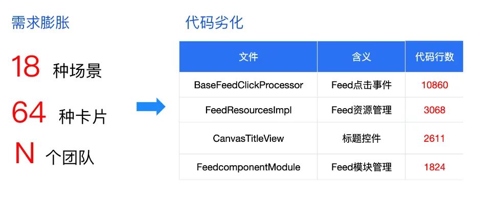 但後續的需求迅速膨脹,異化出18種 Feeds 流場景,單 Feeds 流可能出現60多種卡片。這導致基類代碼與 Feed View 中的代碼迅速膨脹。同時 N 個團隊在同一批代碼中開發,代碼行數和圈複雜度逐漸劣化。