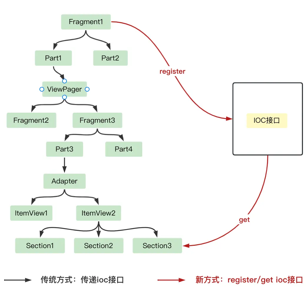 除此之外,另一種容易打穿架構的元素是異化邏輯。比如同一張卡片在不同的頁面需要顯示不同效果,比如數據埋點的參數需要從頁面最外層傳遞到 Section。針對這種跨層級通信的場景,我們設計了一套 IOC 框架來完成依賴注入,將異化邏輯拆分到了一個個 IOC 實現類中。