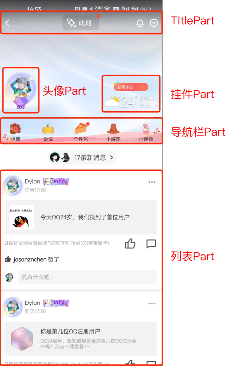 以空間的好友動態頁為例,我們將頁面不同功能的代碼都拆分到一個個 Part 裏,Fragment 僅作為一個容器,負責組裝自己需要的 Part。