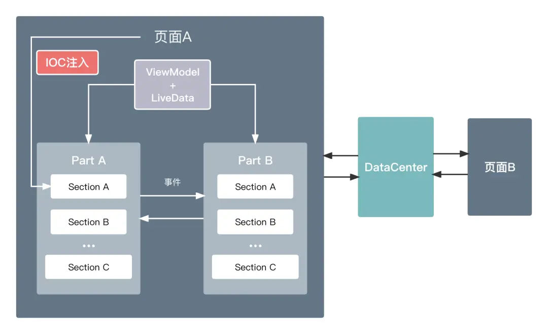 | 頁面與 Part:ViewModel + LiveData; Part 與 Part:頁面級事件,事件只在 PartHost 內部生效,無需註冊與反註冊; 頁面與頁面:DataCenter 數據同步。 |