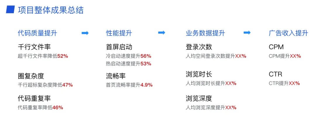 從我們 AB 測試的實驗數據來看,重構的整體結果是比較正向的,代碼質量提升與性能提升帶來了業務指標的提升,業務指標的提升也帶來廣告指標的提升。