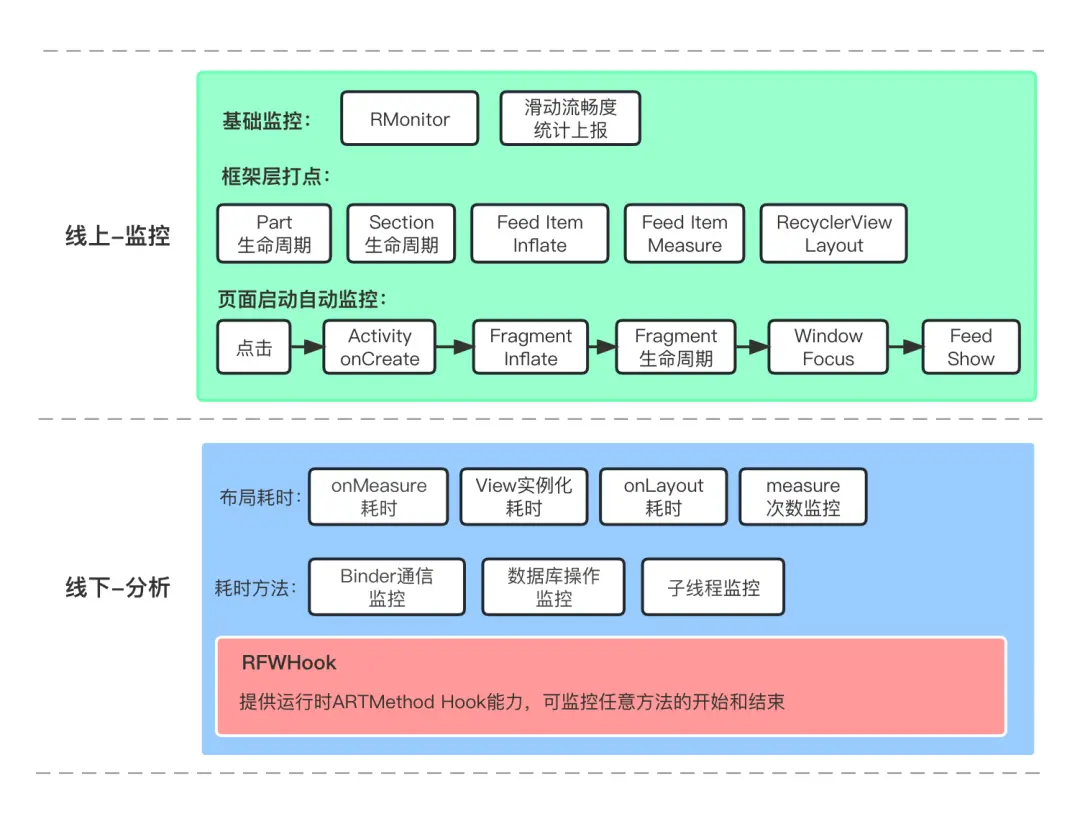 | 利用手 Q RMonitor 框架的監控和我們自己上報的滑動流暢度指標,來監控頁面整體的流暢度; 通過在框架層打點,來監控每一個 Part、Section 或 Feed 的耗時。有劣化的模塊引入時能快速發現; 實現 RFWTracer 框架,自動在頁面啓動流程中打點,統計頁面啓動各階段的耗時。 |