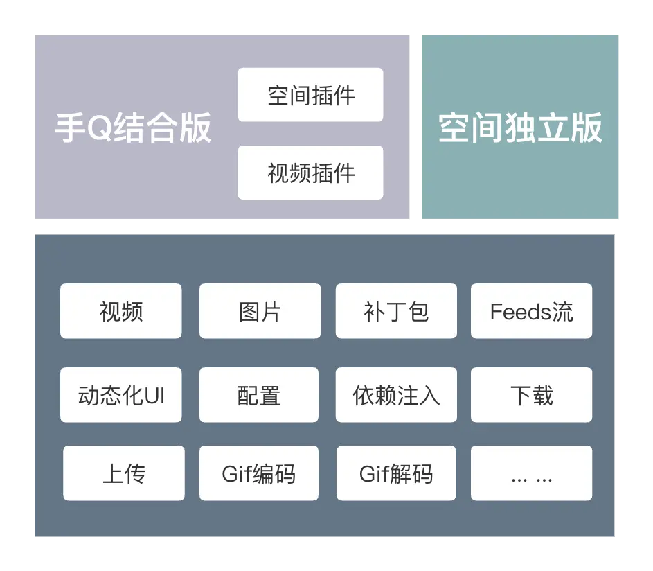 這裏先簡單介紹一下空間的業務形態:空間目前主要的入口是在手 Q 裏,我們叫做結合版。同時獨立版的空間 App 還在維護(沒錯,空間獨立 App 仍然還有一批忠實觀眾)。可以看到,空間有一套獨立於手 Q 之外的架構,結合版與獨立版會共用大量技術組件和業務組件。
