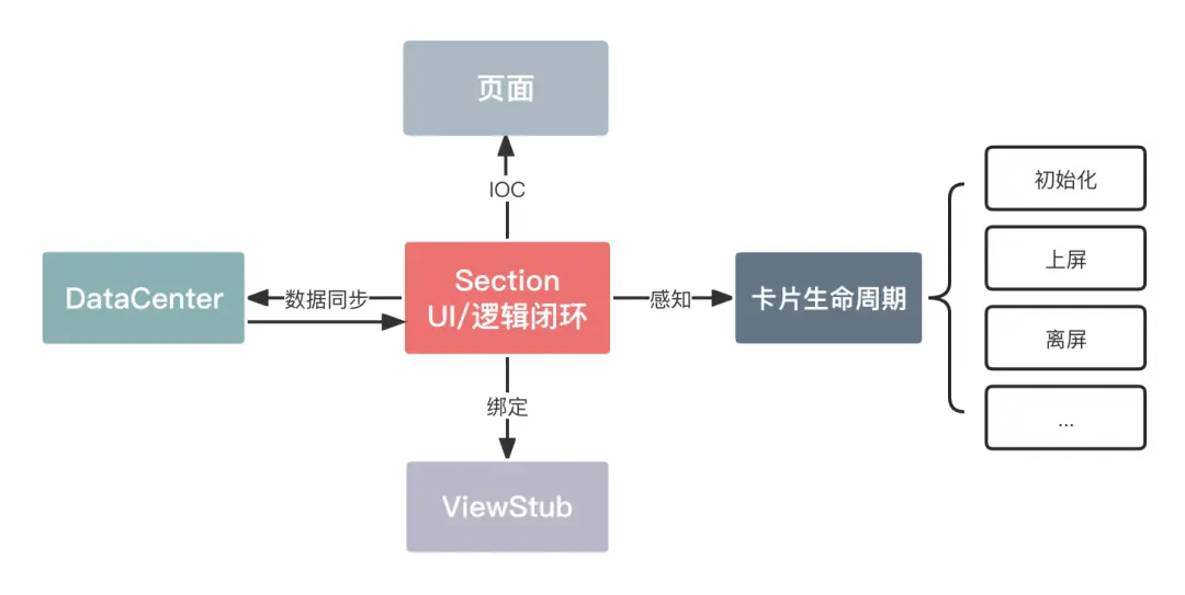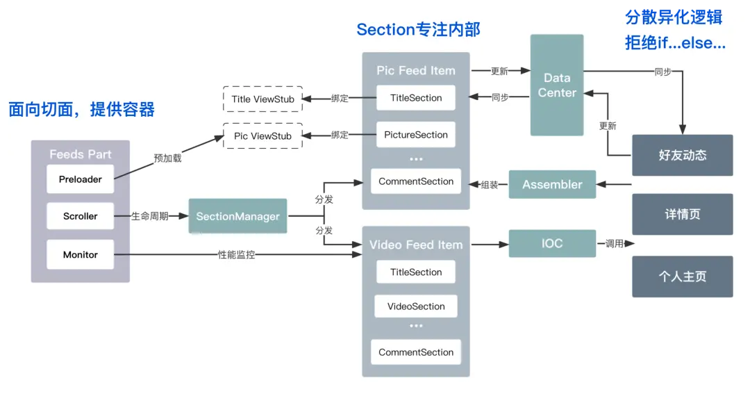 | Section:某一切片的完整 UI+邏輯; ViewStub:與 Section 一對多,按需加載; Assembler:負責組裝 Section,可根據頁面異化; SectionManager:綁定數據、分發生命週期; DataCenter:Feeds 相關數據在各頁面間的同步; IOC 框架:控制反轉,用於 Section 與頁面交互。 |