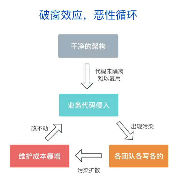 空間的業務邏輯本身就很複雜,代碼的劣化使其複雜度暴增,後續接手團隊已有心無力,只能縫縫補補又三年,惡性循環。